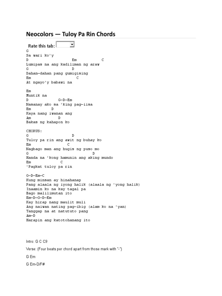 The Lyrics for Tuloy Pa Rin by Neocolours have been translated into 3 languages. Tula tungkol sa Pangarap Tuloy Pa Rin. Nagbago man ang hugis ng puso mo.